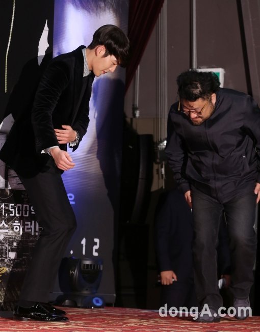 베우 김우빈이 18일 오전 서울 광진구 건대입구 롯데시네마에서 열린 영화 '기술자들' 제작보고회에서 배우 고창석에게 인사를 하고 있다.