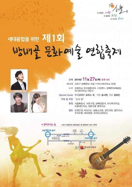 사회적 기업 ‘손과 발’(이사장 한광수)은 27일 오후 4시 서초구 지역아동복지센터인 하나복지학교 강당(서초구 방배천로 16길 17)에서 부촌으로 알려진 서초, 강남의 사각지대에 살고 있어 상대적 박탈감이 더 큰 저소득 주민들을 위한 한바탕 문화 잔치 ‘제1회 방배골 문화예술대축제’를 개최한다.