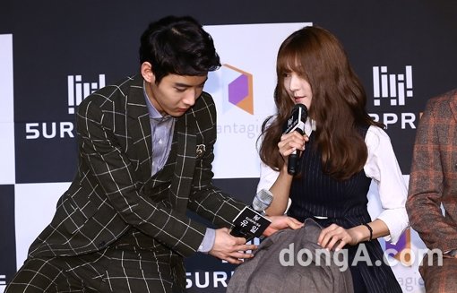 배우 그룹 서프라이즈의 멤버 유일이 18일 오후 서울시 강남구 청담 씨네시티 엠큐브에서 열린 첫 번째 싱글 ‘5URPRISE 1st SINGLE-From my heart’의 쇼케이스에서 깜짝 방문한 김새론에게 옷을 덮어주고 있다.
