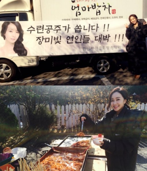 사진 속 김민서는 장나라가 ‘장미빛 연인들’ 촬영장에 보낸 분식차와 커피차를 배경으로 밝게 미소 짓고 있다. 분식차에 걸린 현수막에는 ‘수련공주가 쏩니다!! 장미빛 연인들 대박!’이라 글귀와 함께 ‘김민서 팬클회장 장나라’라고 적혀 있어 두 사람의 훈훈한 우정이 보는 이들로 하여금 미소를 자아낸다.