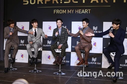 배우그룹 서프라이즈가 18일 오후 서울시 강남구 청담 씨네시티 엠큐브에서 열린 첫 번째 싱글 ‘5URPRISE 1st SINGLE-From my heart’의 쇼케이스에서 기자간담회를 하고 있다.