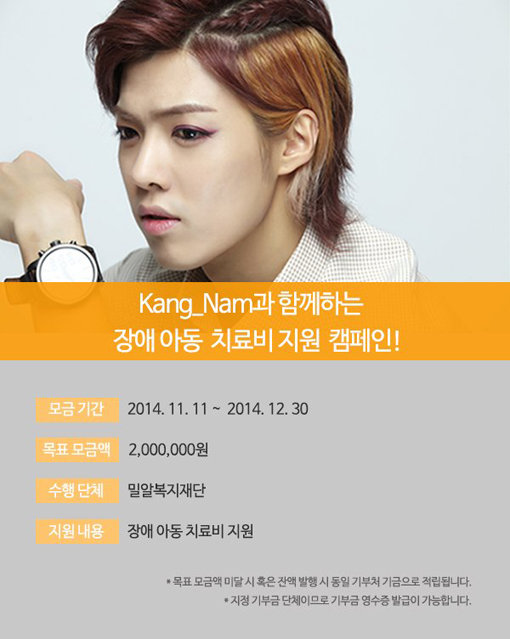 ‘예능대세’로 급부상한 남성그룹 M.I.B 강남이 장애아동 치료비 마련을 위해 캠페인을 벌인다. 강남은 온라인 기부단체 ‘위제너레이션’이 진행하는 시각·뇌병변 장애를 앓는 민우(가명) 군의 치료비 지원을 위해 기부독려에 나섰다. 강남은 응원영상을 통해 “민우는 여러 장애로 주로 누워서 지내고 혼자서는 일상생활조차 불가능하다”며 후원 참여를 독려하고 있다. 강남은 캠페인 참여자들 중 최고액 기부자, 추첨 당첨자와 저녁을 함께할 예정이다. 캠페인은 12월30일까지 진행되며 모금된 금액은 밀알복지재단에 전액 전달된다.