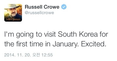 러셀 크로우, 트위터에 직접 올렸다 “내년 1월 방한”