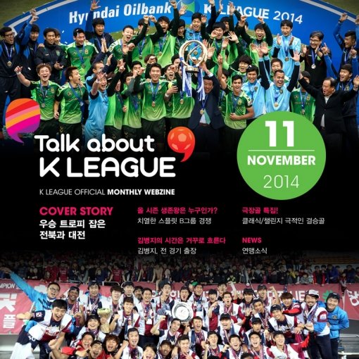 한국프로축구연맹은 20일 현대오일뱅크 K리그 클래식 우승팀 전북현대, 현대오일뱅크 K리그 챌린지 우승팀 대전 시티즌의 우승 스토리와 클래식 그룹B의 치열한 강등전쟁 기록 등을 담은 K리그 공식 웹진 ‘Talk about KLEAGUE’ 11월호를 발간했다.