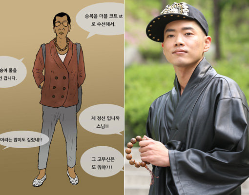 이를 입증하듯 문재원은 극 초반 웹툰 속 일진 스님과 높은 싱크로율을 과시하며 등장한다. 브랜드 로고를 섬세하게 그려 넣은 명품 고무신과 승복을 활용한 다채로운 아이템들이 인상적이다. 그는 패션 배틀 프로그램 ‘패션왕’에서 상상을 초월하는 스타일을 선보이며 극에 재미를 더한다.
