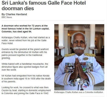 보도에 따르면 갈페이스 호텔의 상징이자 문화였던 도어맨 코타라푸 차투 쿠탄은 스리랑카 최고 호텔인 갈페이스 호텔 로비를 무려 72년이나 지켰다.