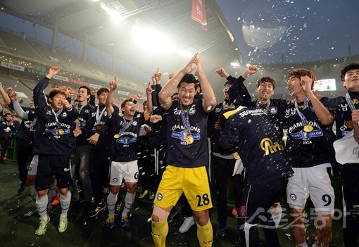 MVP 박준혁(노란 팬츠)을 비롯한 성남 선수들이 23일 서울월드컵경기장에서 열린 FA컵 결승에서 서울을 꺾고 우승한 뒤 서포터스 앞에서 환호하고 있다. 성남 선수들은 ‘지난달 22일 서울 선수들이 결승 상대로 성남이 확정된 뒤 쾌재를 불렀다’는 소식을 전해 듣고 더 분발한 것으로 알려졌다. 이날 성남 라커룸에는 ‘니네 접 때 버스서 비웃었다며? 오늘은 질질 짜게 해줄게 ㅋㅋㅋ’ 라는 글귀가 붙었다. 상암|임민환 기자 minani84@donga.com 트위터 @minana84