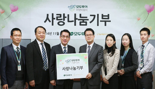 모두투어는 21일 본사에서 ‘제1회 모두투어 여행박람회’ 기간 중 세계음식축제와 카페 운영으로 발생한 수익금 일부로 냉장고와 프린터를 장만해 한국백혈병 어린이재단 소아암 어린이 쉼터에 기부했다.