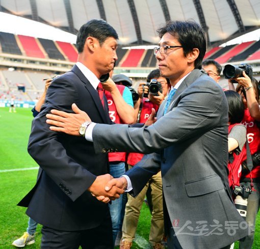 서울이 FA컵에서 준우승에 그친 탓에 26일 상암벌에서 열릴 포항과의 K리그 클래식 37라운드 맞대결에 관심이 더 고조되고 있다. 서울 최용수 감독(왼쪽)과 포항 황선홍 감독의 자존심이 걸린 명승부가 예상된다. 스포츠동아DB