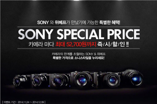 소셜커머스 위메프는 소니코리아와 함께 12월9일까지 ‘SPECIAL PRICE’ 기획전을 진행한다고 밝혔다. 하이엔드부터 캠코더까지 소니 카메라 라인업 중 인기 모델만을 모아 최대 5만2700원 할인된 가격으로 한정 수량 선보인다.