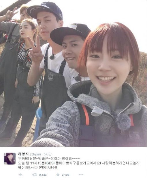 허영지는 셀프 카메라로 촬영한 사진과 함께 "뚜둥!여러분~맛좋은~장어가 왔어요. 오늘 밤 11시15분!!SBS! 룸메이트식구들보러모이세요! 사랑하는하라언니도놀러왔어요!!본!방!사!수!!"라는 '룸메이트' 홍보 글을남겨 '룸메이트'에 대한 멤버들의 애정을 고스란히 전하고있다.
