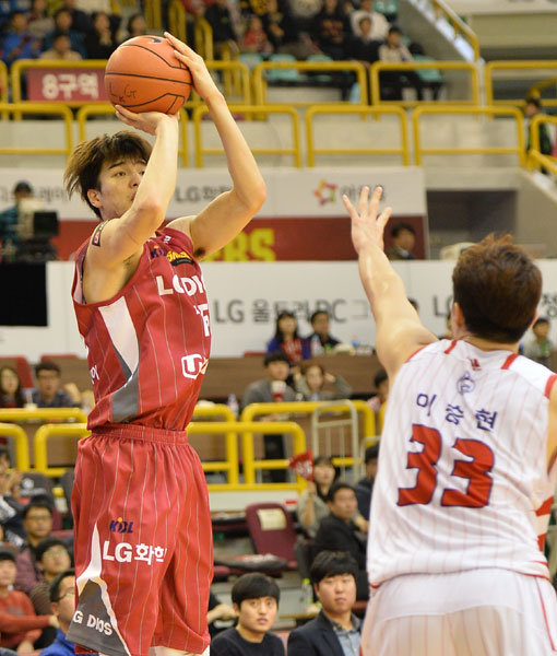 LG 김종규(왼쪽)는 농구대표팀 합류 이후 중거리슛의 정확성이 한층 좋아졌다. 그러나 김종규가 더 위력적인 모습을 보이려면 외곽뿐 아니라 골밑에서도 적극성을 보여야 한다는 것이 전문가들의 조언이다. 사진제공|KBL