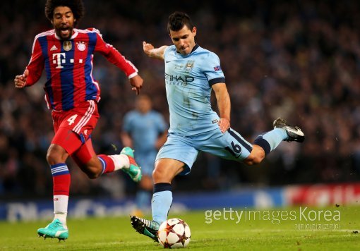 맨체스터 시티(잉글랜드)의 세르히오 아궤로가 26일(한국시간) 잉글랜드 맨체스터 에티하드 스타디움에서 열린 바이에른 뮌헨(독일)과의 2014~2015 유럽축구연맹(UEFA) 챔피언스리그 조별리그 E조 5차전 홈경기에서 후반 40분 동점골을 터뜨리고 있다.