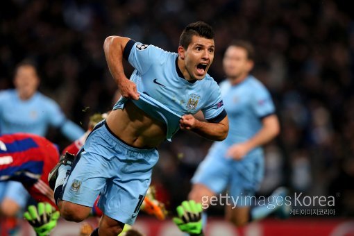 맨체스터 시티(잉글랜드)의 세르히오 아궤로가 26일(한국시간) 잉글랜드 맨체스터 에티하드 스타디움에서 열린 바이에른 뮌헨(독일)과의 2014~2015 유럽축구연맹(UEFA) 챔피언스리그 조별리그 E조 5차전 홈경기에서 후반 추가시간 결승골을 터뜨린 뒤 환호하고 있다.