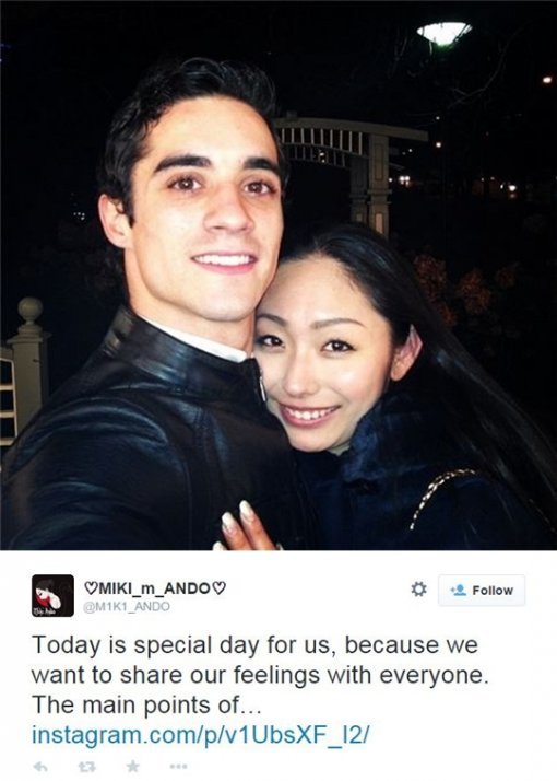 26일 오전 안도미키는 자신의 SNS에 스페인 피겨 스타 하비에르 페르난데스와 교제 중임을 발표했다. 안도 미티는 "우리의 감정을 모든 이들과 함께하기로 한 오늘은 우리에게 특별한 날입니다"라며 "우리 관계의 중요한 점은 즐거운 가족관계를 만드는 것"이라고 글을 적었다. 페르난데스 역시 자신의 SNS에 교제 사실을 알렸다.