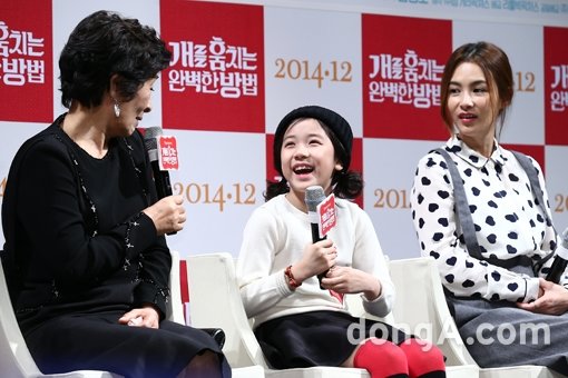 배우 김혜자(왼쪽부터), 이레, 강혜정이 26일 오전 서울시 강남구 압구정CGV에서 열린 영화 ‘개를 훔치는 완벽한 방법’ 제작발표회에서 기자간담회를 하고 있다.