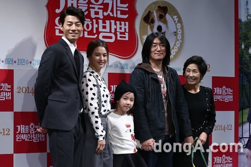 배우 이천희, 강혜정, 이레, 김성호 감독, 김혜자가 26일 오전 서울시 강남구 압구정CGV에서 열린 영화 ‘개를 훔치는 완벽한 방법’ 제작발표회에서 하고 있다.