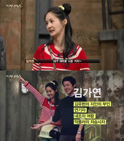 무엇보다 김가연은 첫 등장부터 2층에서 뛰어내리려는 모션을 취하고 나이에 대한 장동민의 도발에 하이킥을 날리는 등 예능감을 뽐내 눈길을 끈다. 또 “남편이 바쁘다 보니 난 그냥 대타로 나온 거다. 혼자 알아서 게임을 하든지 말든지 난 여기서 남편의 체취를 느끼며 즐기려고 한다”고 말하는 등 엉뚱하면서도 발랄한 모습으로 프로그램에 새로운 활력을 불어넣을 예정이다.