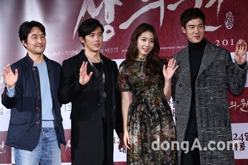 배우 한석규(왼쪽부터), 고수, 박신혜, 유연석이 26일 오후 서울시 중구 동대문 메가박스에 열린 영화 ‘상의원’ 제작보고회에서 포토타임을 하고 있다.