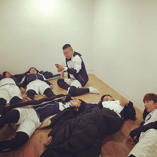 공개된 사진에는 KBS TV ‘우리 동네 예체능’(이하 예체능) 출연진이 방에 모여 있는 모습이 담겨 있다. 특히 강호동을 제외한 ‘예체능’ 멤버들은 피곤한지 모두 맨바닥에 누워 있는 모습이다.