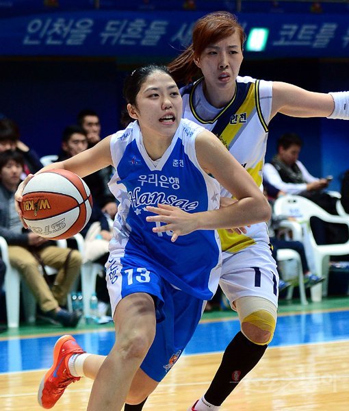 우리은행 이승아(왼쪽)가 26일 인천 도원체육관에서 열린 신한은행과의 원정경기 도중 조은주의 수비를 뚫고 골밑 공격을 시도하고 있다. 인천|김종원 기자 won@donga.com 트위터 @beanjjun