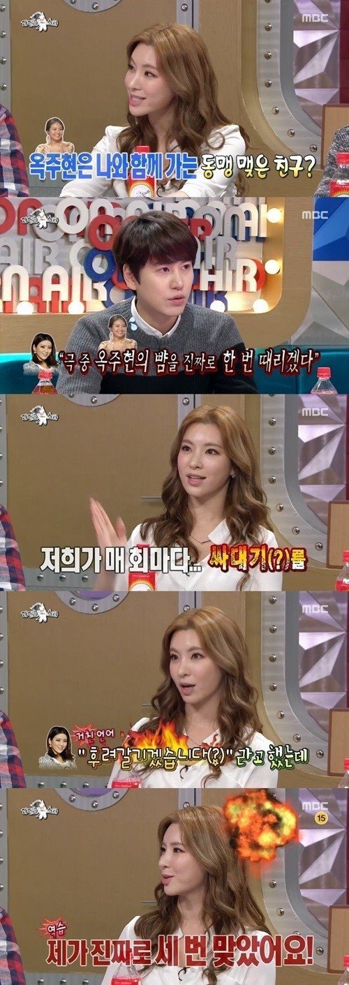 정선아는 26일 방송된 MBC ‘황금어장-라디오스타’에서 “옥주현에게 공연 중 뺨을 맞았다”라고 말했다.