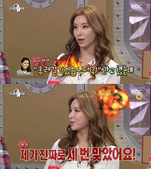 정선아는 "장난 삼아 '옥주현의 뺨을 후려갈기겠습니다'라고 했는데 실제 공연 때는 내가 세 번이나 맞았다. 원래는 다 속임수다. 음향과 맞춰서 하는 건데 세 번 정도 진짜 때리더라"라고 말해 웃음을 자아냈다.