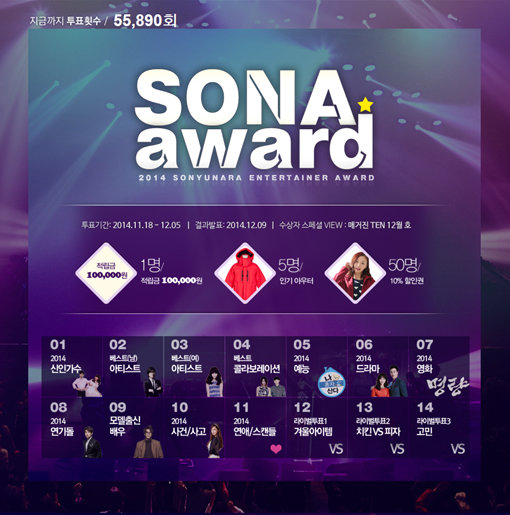 11월 18일부터 12월 5일까지 진행되는 ‘2014 소나 어워드’는 20일 오후 현재 4만여건에 이르는 투표수를 기록 중이다. 소녀나라 회원들은 각 부문 1일 1회의 투표가 가능하며 결과는 12월 9일 공개된다. 투표 참가자에게는 추첨을 통해 소녀나라 적립금 10만원, 아우터, 10% 할인권 등을 증정한다.
