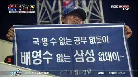 이에 과거 한 삼성 팬의 배영수 응원 플래카드가 새삼 화제가 됐다. 이 팬이 들고 있는 플래카드에는 “국·영·수 없는 공부 없듯이 배영수 없는 삼성 없데이~”라는 문구가 적혀있다. 삼성 팬들의 배영수에 대한 애정을 확인할 수 있는 모습이다.