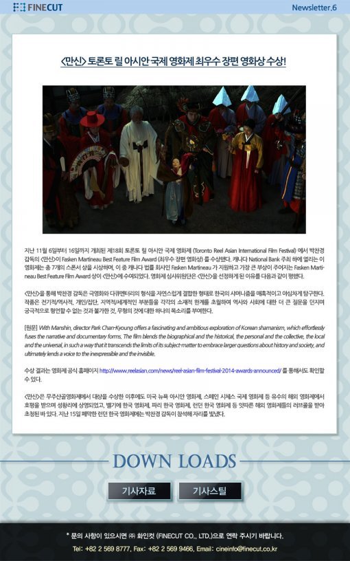 ‘만신’은 무주산골영화제에서 대상을 수상한 이후에도 미국 뉴욕 아시안 영화제, 스페인 시체스 국제 영화제 등 유수의 해외 영화제에서 호평을 받으며 성황리에 상영되었고, 벨기에 한국 영화제, 파리 한국 영화제, 런던 한국 영화제 등 잇따른 해외 영화제들의 러브콜을 받아 초청된 바 있다. 지난 15일 폐막한 런던 한국 영화제에는 박찬경 감독이 참석해 자리를 빛냈다.