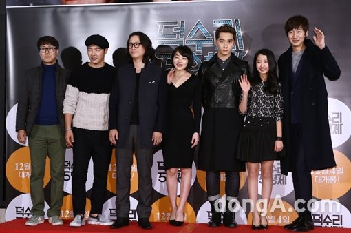 전형준 감독(왼쪽부터), 배우 윤상현, 송새벽, 이아이, 황찬성, 김지민, 이광수가 27일 오후 서울시 광진구 건대입구 롯데시네마에서 열린 영화 ‘덕수리 5형제’ VIP시사회에서 포토타임을 하고 있다.