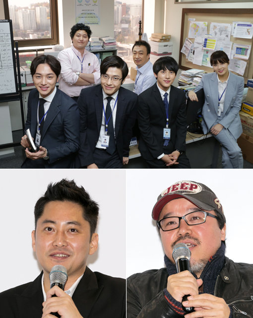 미생 출연진(맨 위)·이재문PD·윤태호작가(아래 오른쪽). 사진제공|CJ E&M