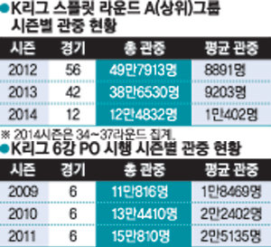 전북과 성남의 챔피언 결정전을 포함한 2009시즌 6강 PO 6경기를 관전한 총 관중은 11만 816명에 달했다. 경기당 1만8469명이 찾은 것이다. 여기에 매 경기 스포츠전문 케이블채널이 중계를 했고, 지상파TV를 통해 2차례 전파를 탔다. 2010시즌과 2011시즌에도 꾸준히 관심도가 높아졌다. 2010년 6강 PO의 총 관중은 13만4410명이었고, 평균 2만2402명이었다. 또 서울월드컵경기장에서 벌어진 서울-제주의 챔피언 결정 2차전에는 역대 6강 PO 최다인 5만6759명의 관중이 입장했다. 2011년에는 평균 관중이 2만5135명에 이르렀고, 총 관중은 15만810명이었다. 지상파TV 중계는 2010년 1차례 이뤄졌다면, 2011년에는 다시 2차례로 늘어났다.