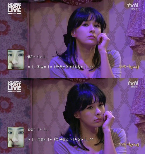 콩트 말미 채연은 “나는 가끔 눈물을 흘린다”며 코믹스러운 포즈를 선보였다. 이는 10년 전 채연이 SNS에 올려 주목받은 눈물 셀카를 표현한 것.