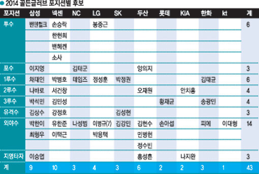 황금장갑의 주인공은 누구일까. 한국야구위원회(KBO)는 30일 2014한국야쿠르트 7even세븐 프로야구 골든글러브 포지션별 후보를 확정해 발표했다. 총 10개 포지션에 43명의 후보가 이름을 올렸다. 골든글러브는 선정 투표는 1일부터 5일까지 올 시즌 프로야구를 취재한 기자와 사진기자, 중계담당PD, 해설위원, 아나운서 등 미디어 관계자를 대상으로 실시한다. 골든글러브 시상식은 9일 오후 4시50분 서울 삼성동 코엑스 오디토리움(신관 3층)에서 진행되며, KBS 2TV와 포털사이트 NAVER, DAUM을 통해 생중계된다. 수상자는 시상식 당일 현장에서 발표된다.