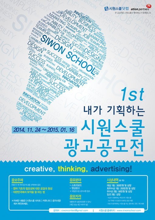 이처럼 겨울이 다가오면서 다양한 공모전이 시작되고 있는데, 그 중에서도 지난 11월 24일부터 시작한「1st 내가 기획하는 시원스쿨 광고공모전」은 650만원이라는 높은 상금과 창립 후 처음으로 개최되는 공모전이라는 점에서 눈길을 끈다.