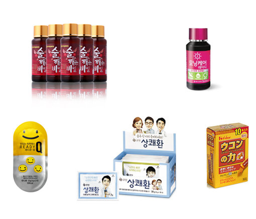 하이트진로음료 ‘술깨는비밀’, 동아제약 ‘모닝케어 레이디’, 디알엑스플러스 ‘우콘파워’, 삼양사 큐원 ‘상쾌환’, 한독 ‘레디큐 츄’ (왼쪽 위부터 시계방향).