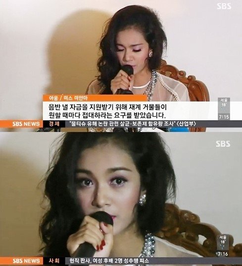 한편, 미스 미얀마 메이 타 테 아웅은 지난 5월 서울에서 열린 ‘미스 아시아퍼시픽월드’에서 우승 후 시가 2억원 상당의 왕관과 함께 잠적했다. 이후 8월 미얀마에서 기자회견을 열어 “대회 관계자가 전신성형과 성접대를 강요했다”고 전했다.