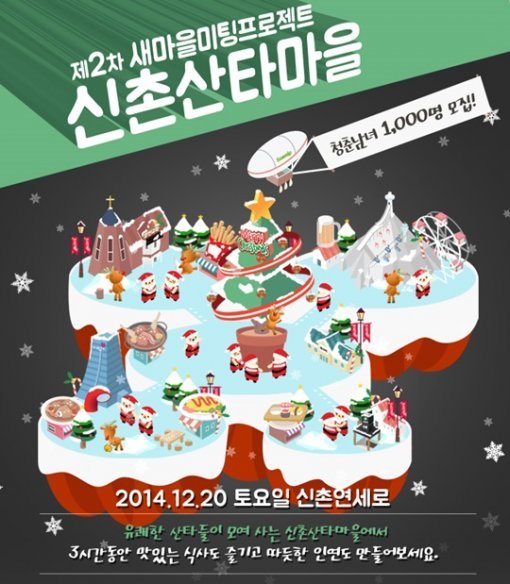 4일 새마을미팅프로젝트는 일본의 거리미팅 '마치콘'을 모티브로 맛집탐방과 미팅이라는 콘셉트의 '새미프 신촌 산타마을' 행사를 오는 20일 개최한다고 공지했다.