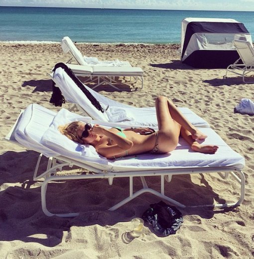 사진에는 가른이 선베드에 누운 채 카메라를 바라보는 모습이 담겨 있다. 그는 비키니를 입고 다리를 교차하는 포즈를 취해 농염한 매력을 발산하고 있다. 특히 비키니 상의 끈이 풀려 있어 상상력을 자극한다.