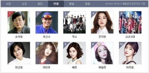 2014년 올해의 검색어는 사건, 신규, 최다, 인물, 영화 등으로 올해 다음 검색 이용자들이 가장 많이 검색한 결과다. 이 가운데 '인물' 순위에서는 지난 4월 세월호 참사 당시 팽목항에서 뉴스를 진행하며 진정성을 보여줘 시청자들로부터 호평을 받은 언론인 손석희가 1위를 차지했다.