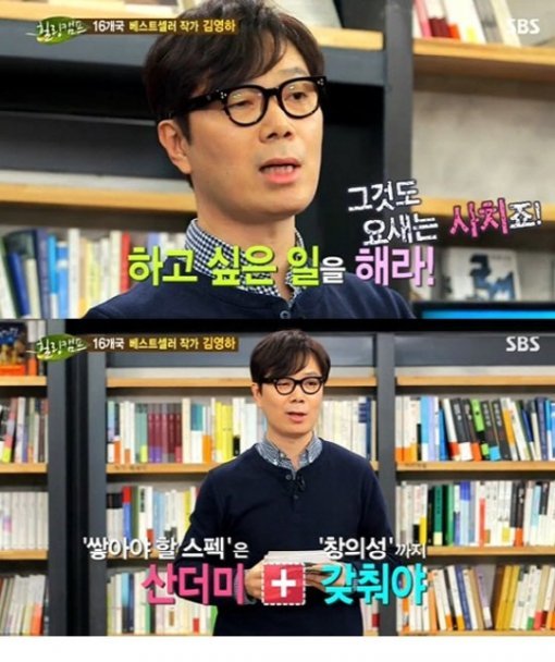 이날 방송에서 김영하는 “(기성세대가) 젊은 세대에게 ‘하고 싶은 일을 하라’고들 하는데 사치다. 요즘은 스펙도 열심히 쌓아야 하고 동시에 창의적이어야 한다. 그런데 하고 싶은 일까지 찾으라고 한다”고 말했다.