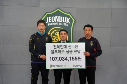 프로축구 K리그 클래식 우승 팀 전북현대 모터스축구단 선수들과 코칭스태프가 클럽하우스가 위치한 전북 완주군에 불우이웃돕기 성금 1억703만4155원을 기부했다.