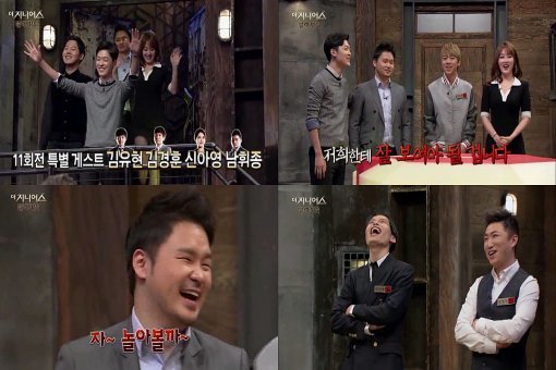 ‘더 지니어스 시즌3’ 제작진은 “11회 오프닝 촬영장에서 탈락자인 수학강사 남휘종, 스포츠 아나운서 신아영, 프로 포커플레이어 김유현, 서울대 대학원생 김경훈이 살아남은 도전자인 카이스트 재학생 오현민, 개그맨 장동민, 한의사 최연승과 다시 만났다”고 밝혔다.