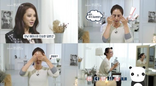 평소 클렌징에 각별히 신경을 쓴다며 메이크업을 닦아내던 송지효는 녹아내린 눈화장이 까맣게 번진 것을 뒤늦게 눈치채고 "나 지금 괜찮아?"라며 화들짝 얼굴을 가려 웃음을 선사했다.