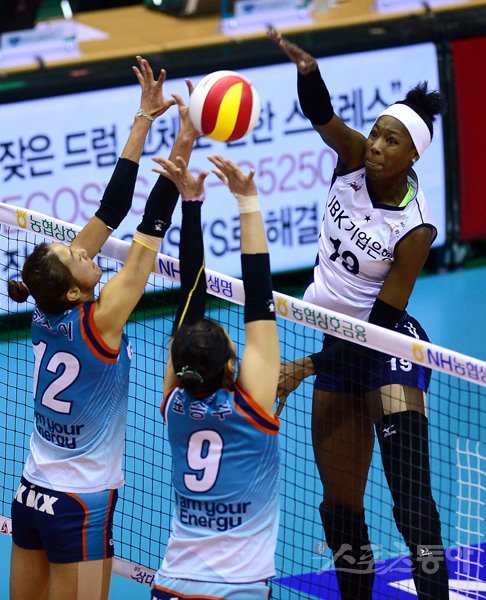IBK기업은행 데스티니(오른쪽)가 11일 평택 이충문화체육관에서 열린 ‘NH농협 2014-2015 V리그’ 여자부 GS칼텍스와의 경기에서 블로킹 벽을 피해 스파이크를 때리고 있다. 데스티니는 이날 45득점을 기록하며 팀 승리를 이끌었다. 평택|김종원 기자 won@donga.com 트위터 @beanjjun