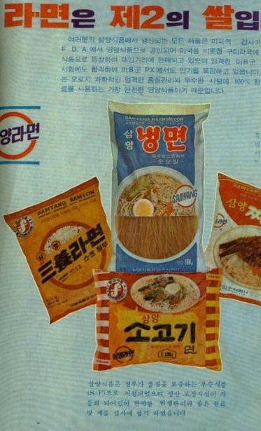 우리나라 최초의 라면인 삼양라면은 주황색 표지 아래 닭고기 스프와 중량 100g으로 당시 10원의 가격에 세상에 나왔다.