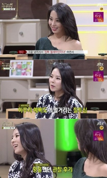 이어 곽정은은 “굉장히 옅은 화장에 캐주얼하게 살짝 파인 티셔츠에 청바지를 입었다. 몸매를 몰래 구경하면서 비결이 뭘까 생각했었다”고 털어놨다.
