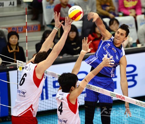 문용관 감독은 블로킹을 하던 산체스가 안테나를 건드렸다고 어필했다. LIG는 비디오판독 기회를 써버려 어필은 받아들여지지 않았다. 경고만 받았고 경기가 오래 중단됐다. 3차례의 듀스가 이어진 첫 세트의 운명은 김요한의 공격아웃과 28-27에서 전진용이 에드가의 백어택을 블로킹으로 잡아내 세트가 끝났다. 블로킹 5-2의 우위가 첫 세트 승패를 갈랐다.