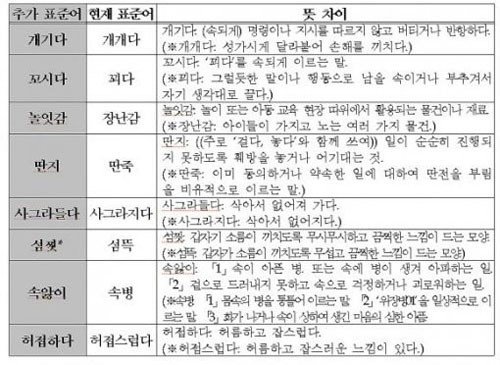 별도 표준어로 인정된 항목은 ‘개기다’(개개다) ‘꼬시다’(꾀다) ‘놀잇감’(장난감) ‘딴지’(딴죽) ‘사그라들다’(사그라지다) ‘섬’(섬뜩) ‘속앓이’(속병) ‘허접하다’(허접스럽다) 등 총 8개가 포함돼 눈길을 끌었다.